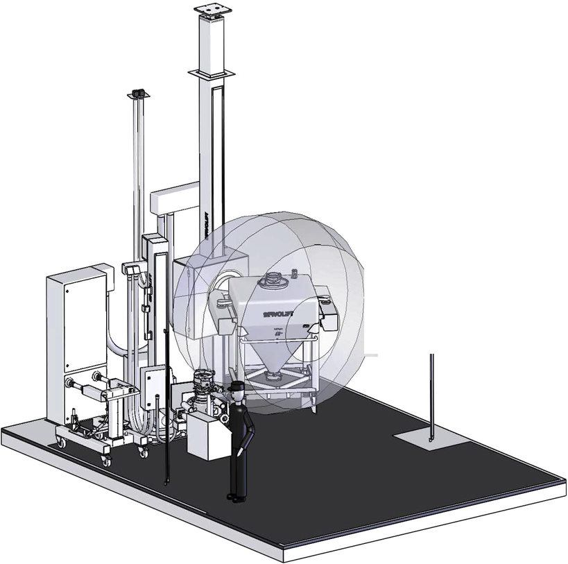 - Der mit Rohmaterial gefüllte IBC (IBC.A) wird mittels einer Hubsäule (Hoist) zur Beschickungsposition über der Mühlenanlage angehoben und ausgerichtet.