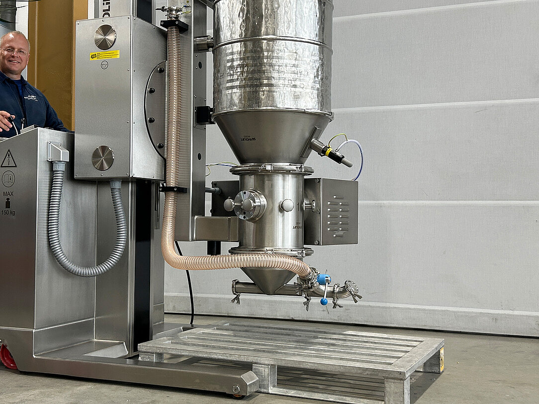In addition, the focus is on improved product handling and quality. An integrated continuous breaker enables clumped products to be broken up directly during the emptying process. This ensures better flowability and a more homogeneous particle size for subsequent process steps. Controlled emptying in ensured by a 180° tilting process and connection to a vacuum pot, which enables targeted and low-dust product removal. The design as a pharmaceutical/cleanroom machine with smooth stainless steel surfaces (1.4301 / 1.4404 / 316 L in contact with the product), which are easy to clean and have small gaps filled with silicone to prevent product accumulation, underlines its suitability for hygienically sensitive environments.